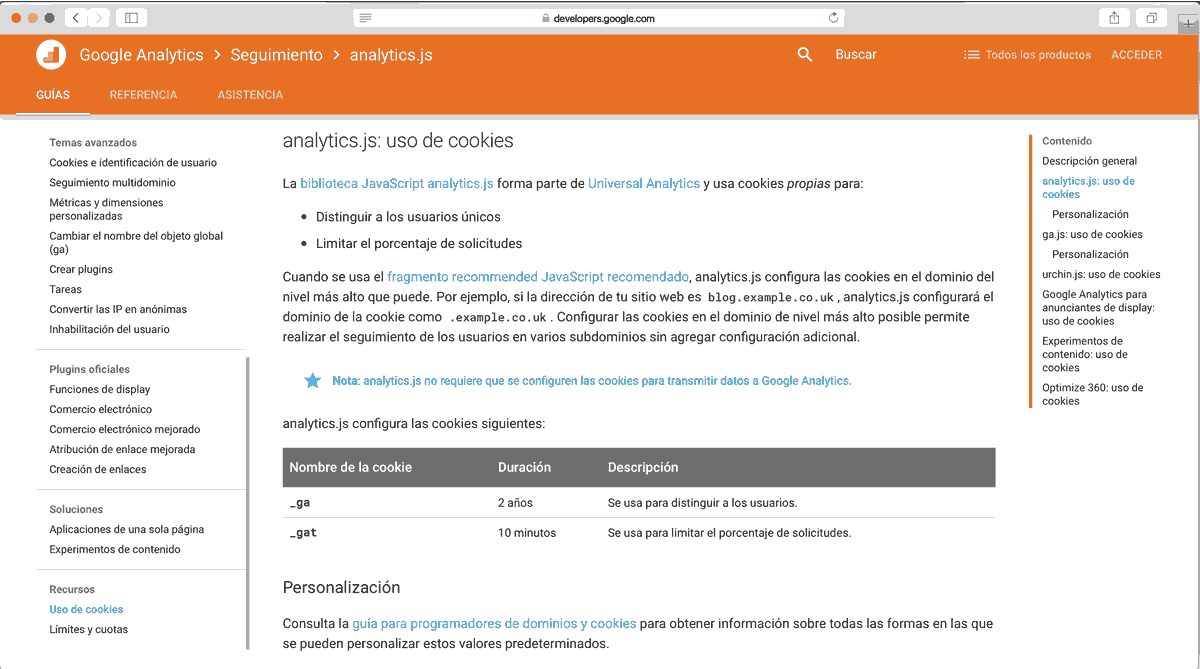 Google Analytics es una herramienta sencilla y fácil de usar que ayuda a los propietarios de sitios web a medir cómo interactúan los usuarios con el contenido del sitio. Cuando un usuario navega por las páginas de un sitio web, Google Analytics proporciona al propietario de dicho sitio etiquetas JavaScript (bibliotecas) para registrar la información sobre la página que ha visto un usuario, por ejemplo, la URL de la página. Las bibliotecas JavaScript de Google Analytics usan cookies HTTP para "recordar" lo que ha hecho un usuario en páginas o en interacciones con el sitio web anteriores.